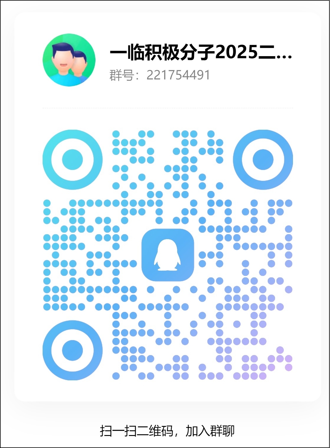 为做好培训管理工作,便于后续发布通知要求,平时答疑解惑,请全体参训学员及时加入QQ群“一临积极分子2025二期”,群号221754491,并下载学习强国APP, 及时扫码加入学院的学习强国平台积极分子学习组。如有学员在登陆浙江中医药大学APP智慧党建网上党校学习时遇到异常问题,可群内联系学院组织员王老师咨询,电话86633163。